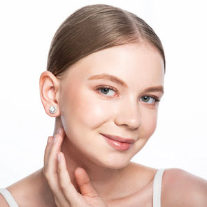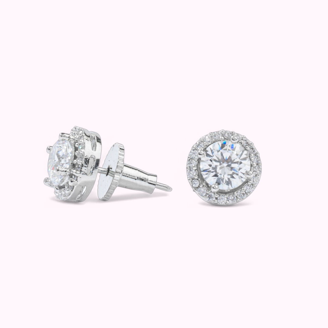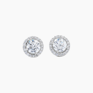 • Radiant halo-style studs in luxury rhodium-plated metal