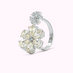• Statement 92.5 silver cocktail ring featuring two flower-shaped Swarovski solitaires in pale yellow and white diamonds