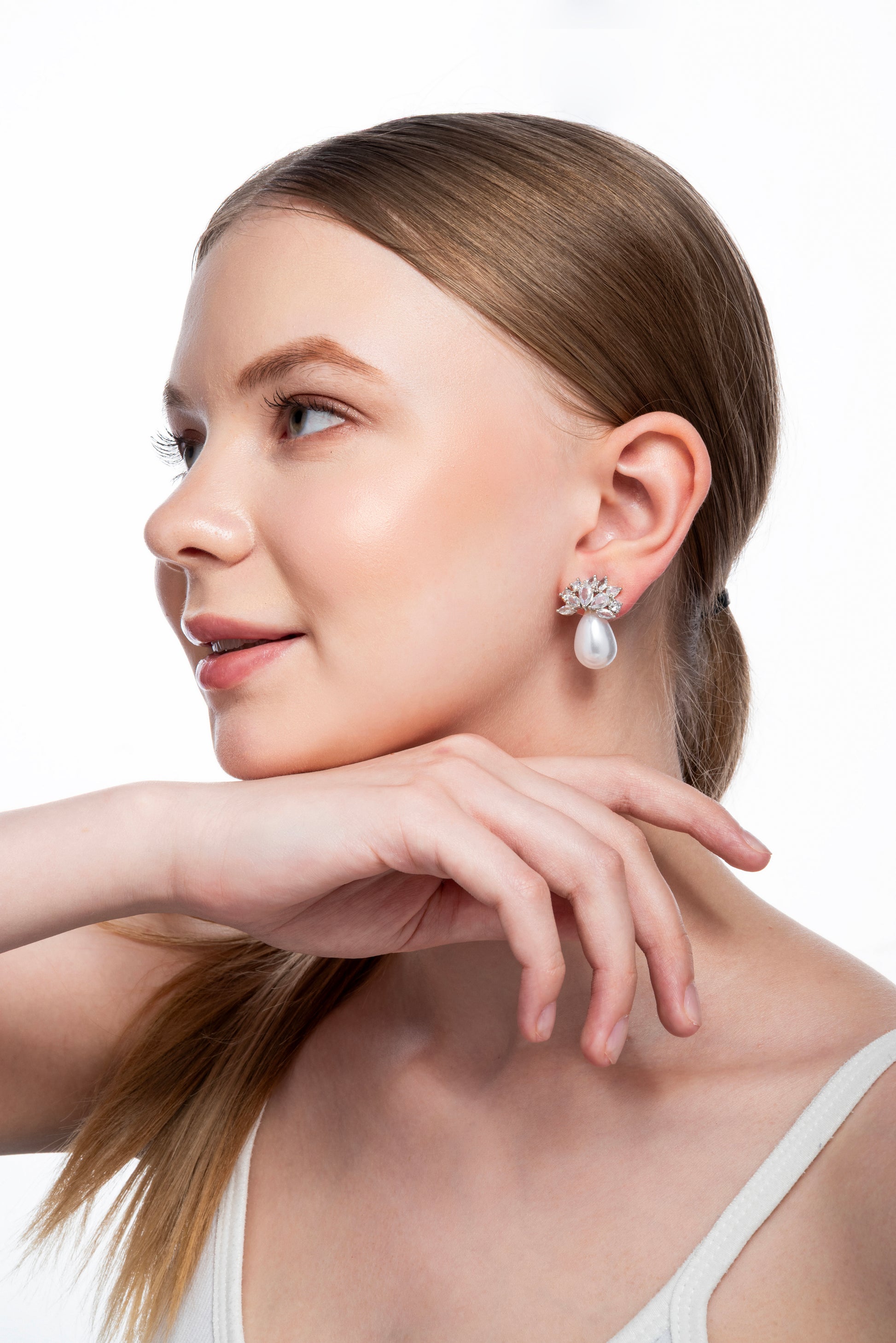 • Elegant rhodium-plated metal earrings featuring a pearl drop accented by clustered Swarovski solitaires