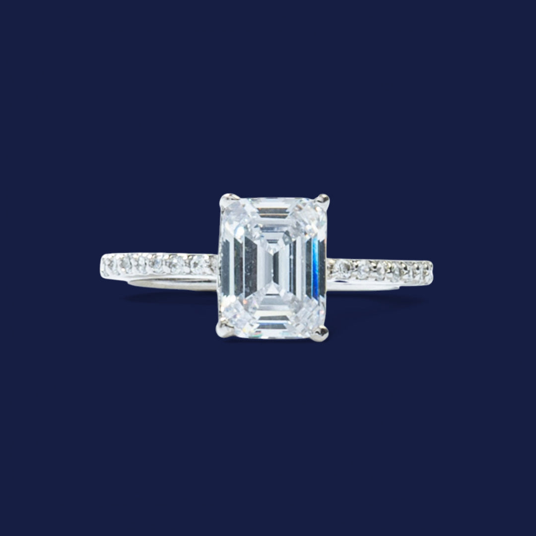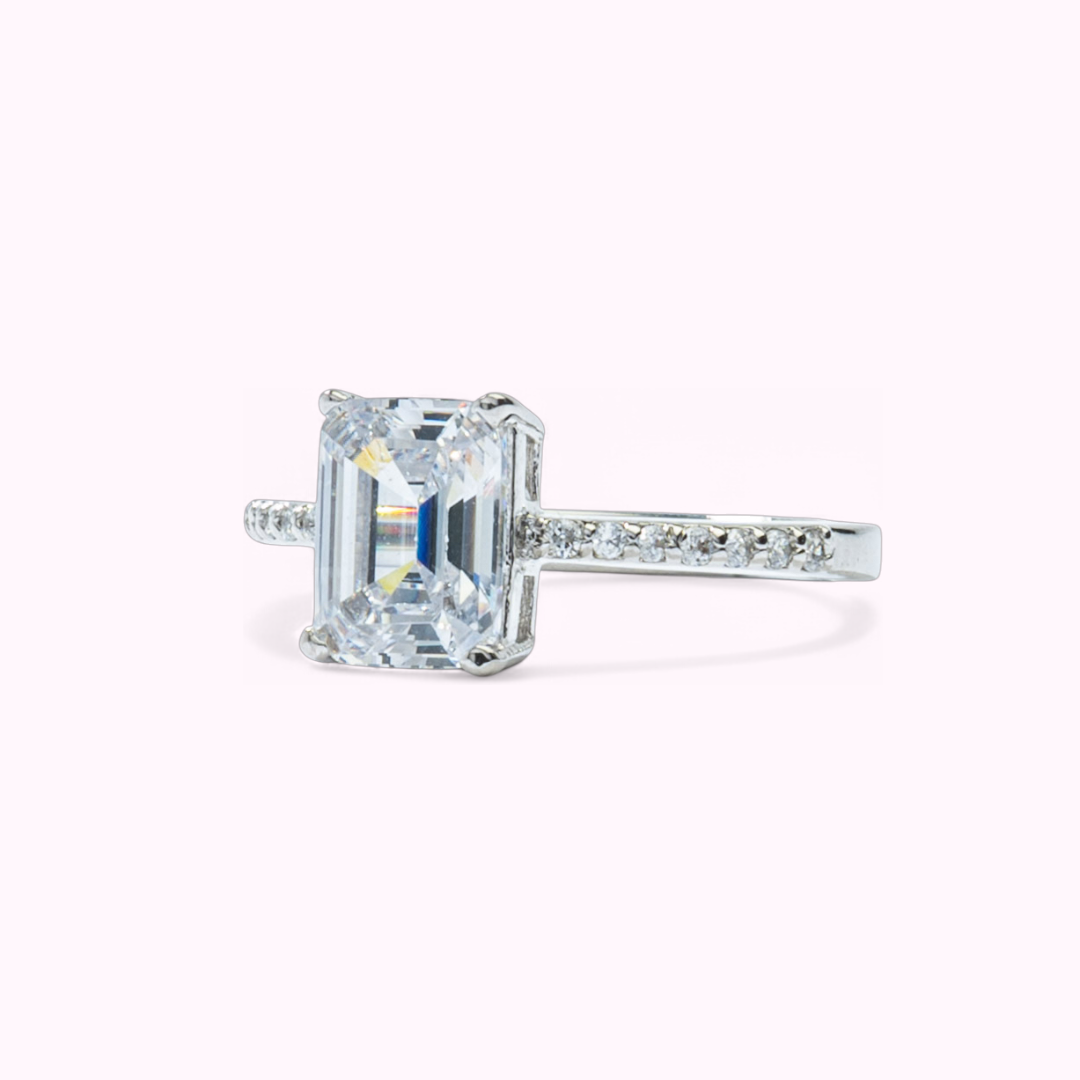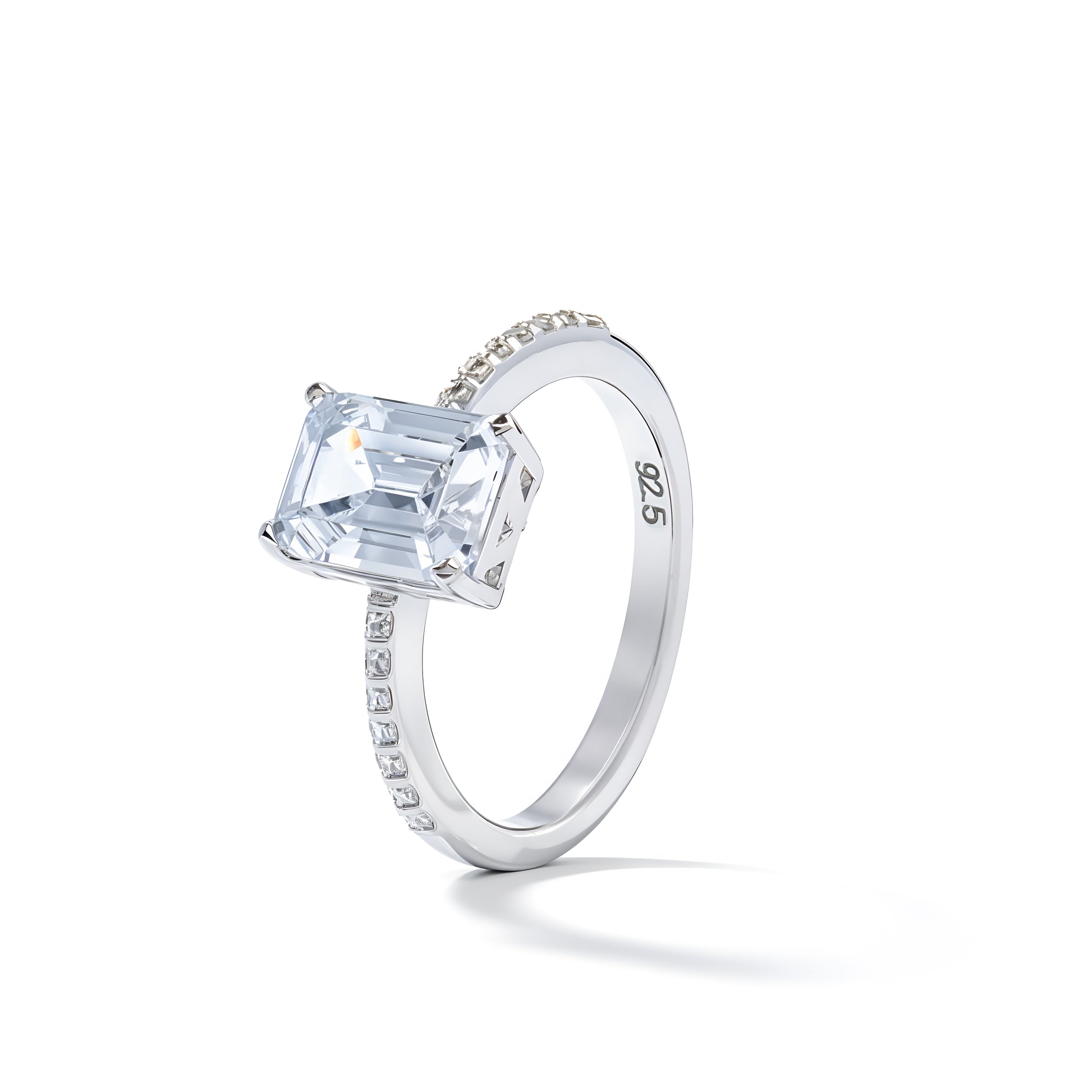 • Elegant 92.5 silver ring featuring a dazzling emerald-cut Swarovski solitaire with delicate crystals along the band